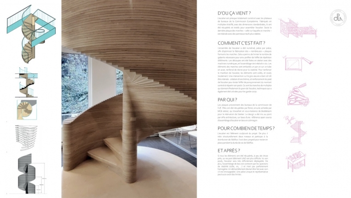 La pièce maîtresse de ce projet est le tout nouvel escalier de plus de 4 mètres de haut, composé à 100 % de matériaux recyclés et réaliser par MCB atelier
