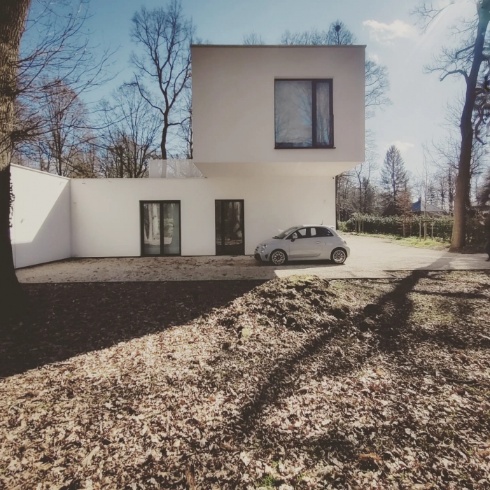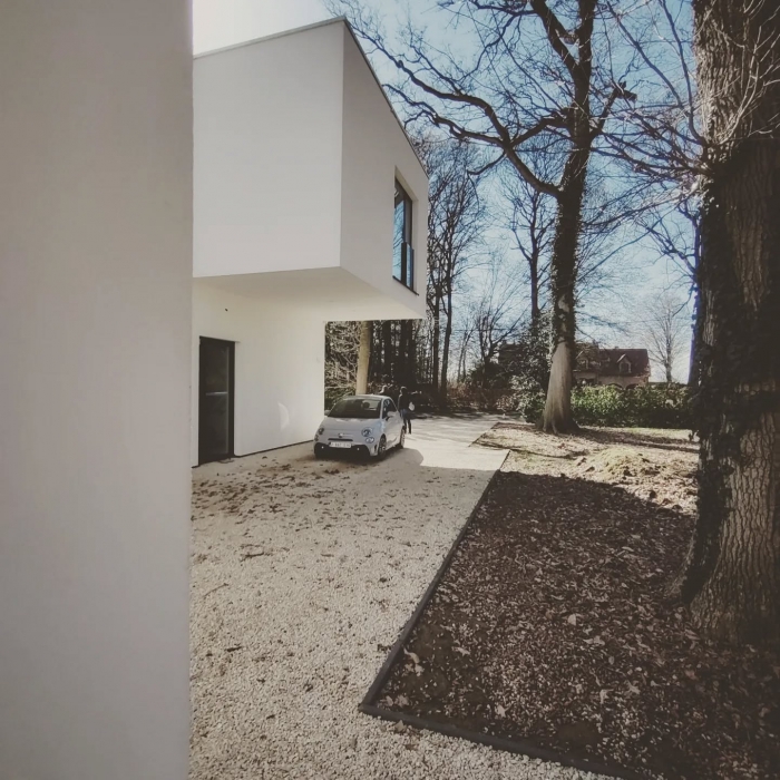EN_ The project is set within a densely wooded plot in Petit?Enghien, positioned deliberately away from the street to preserve the natural, bucolic character of the site. A first vegetated filter ensures privacy and creates a soft transition from the public realm. The house unfolds over two levels, with daytime functions on the ground floor and nighttime spaces upstairs. Technical rooms, storage areas and the garage are placed along the street façade, forming a protective buffer and allowing the living spaces to open fully onto the wooded views at the rear.