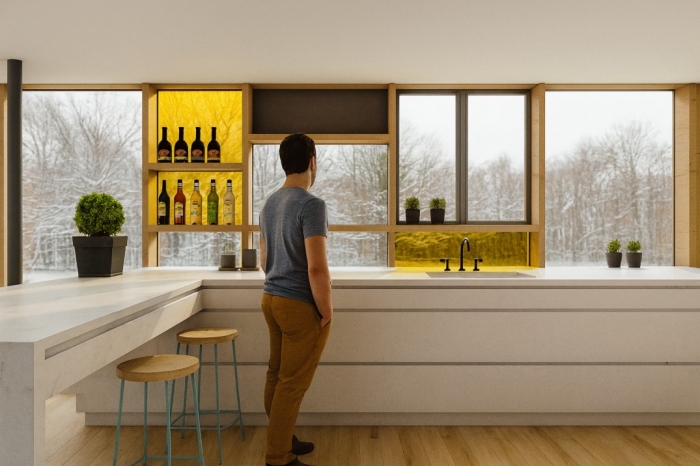 The architectural approach focuses on preserving the character of the existing house: the current timber cladding is maintained and reused wherever possible to retain its authentic patina. The new design introduces a refined composition of openings that frames the landscape and enhances natural light throughout the living areas. The project remains deliberately modest in scale, respecting the original volumes while significantly improving spatial quality and daily comfort.Overall, the renovation creates a warm, coherent and discreet extension that reinforces the home’s relationship with its rural environment and elevates the quality of life inside.